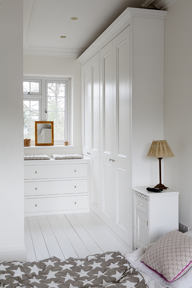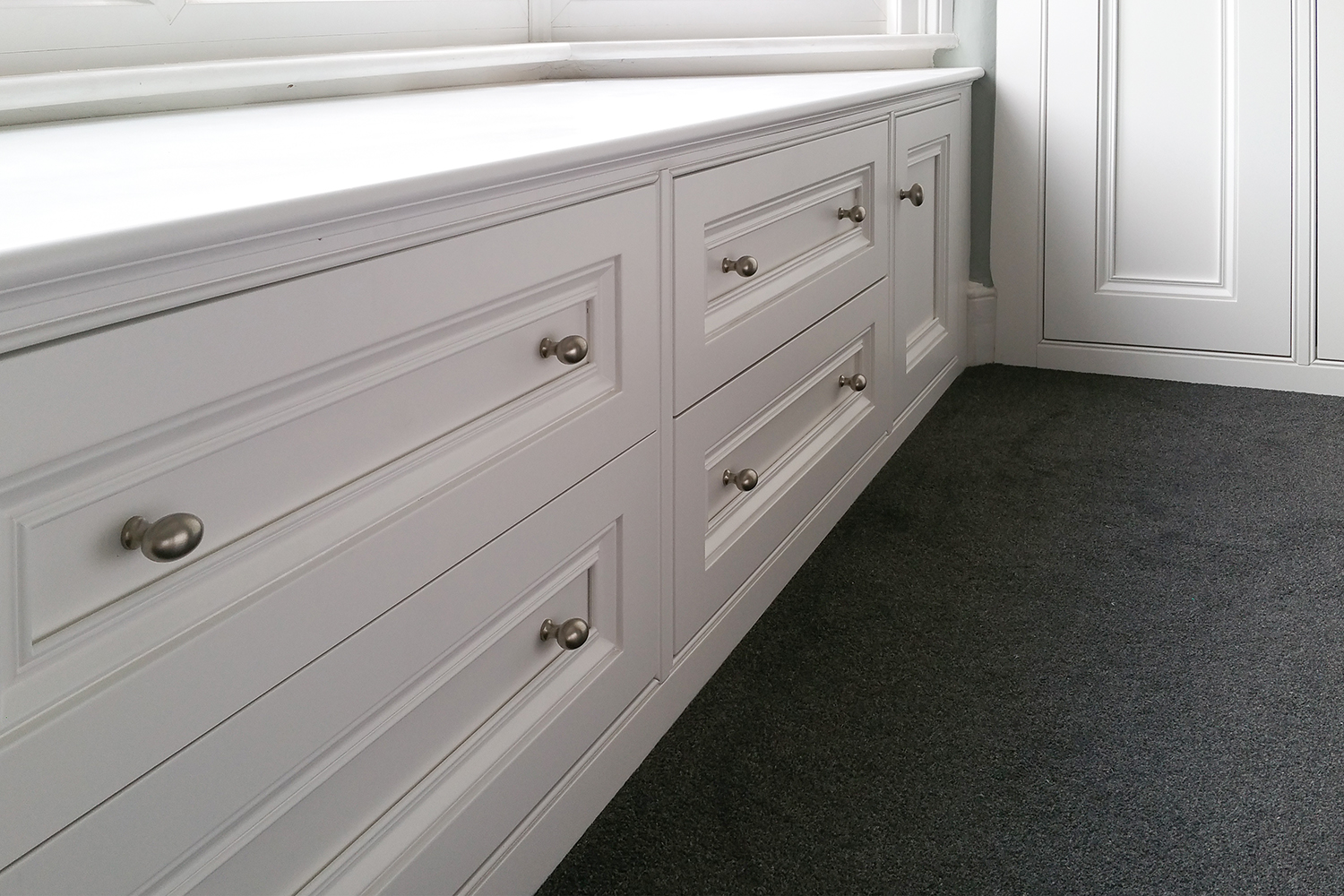 The worktop moulding used on top of drawer units and window seats is an attractive mix of bullnose and scotia which is always seen on the front and often also the side on Victorian staircase steps.